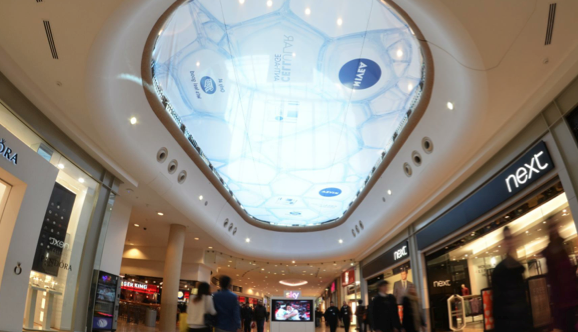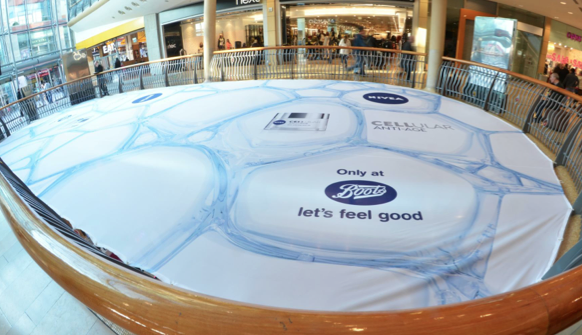 The 7.2m wide by 16.1m long ceiling panel, printed on Polyester, is an irregular shape and was printed in sections and stitched together. It is held in place by a wire tension system that attaches to the mezzanine floor. From brief to installation the job took four weeks and this involved sample sign off and print quality and texture sign off. The campaign also included lift doors and ceiling banners.