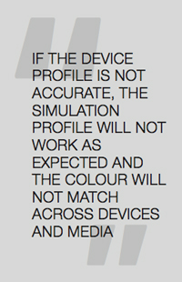 You know theimportance of device profiles, so it is possible to run a wide-format device to its maximum gamut on a chosen substrate? This will result in a differing visual appearance between devices and substrates if not controlled in some way and the use of a simulation profile can solve this issue. This is an ICC profile; normally a CMYK profile which describes the output gamut required if the gamut of the device and substrate is not suitable for the production. This simulation profile can be selected and applied within most wide-format workflows colour management menus. The most usual will be a Fogra 39 based profile, which describes an offset litho press printing on coated papers. This is often used as a common colour gamut for mixed media promotions. The colour management tools within the wide-format workflow will then use the device profile as the starting point to convert the printed output to the chosen simulation profile. This then should result in a very close visual match across differing printers and media. The caveat is the device profile. If this is not accurate, the simulation profile will not work as expected, so the colour will not match across devices and media.