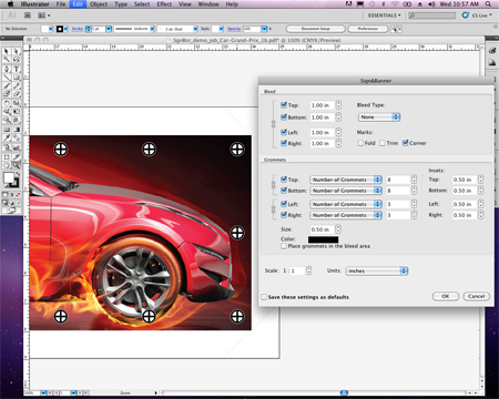 Onyx has developed a couple of plug-ins to work with Illustrator, under the SmartApps brand, which are designed to simplify Illustrator’s use for wide-format production. The Sign&Banner plug-in includes a number of tools to simplify preparing banners for production by adding bleeds, which can be extended beyond the Illustrator limitations, as well as trim lines and grommet marks. It’s also possible to set up presets using Adobe Actions.