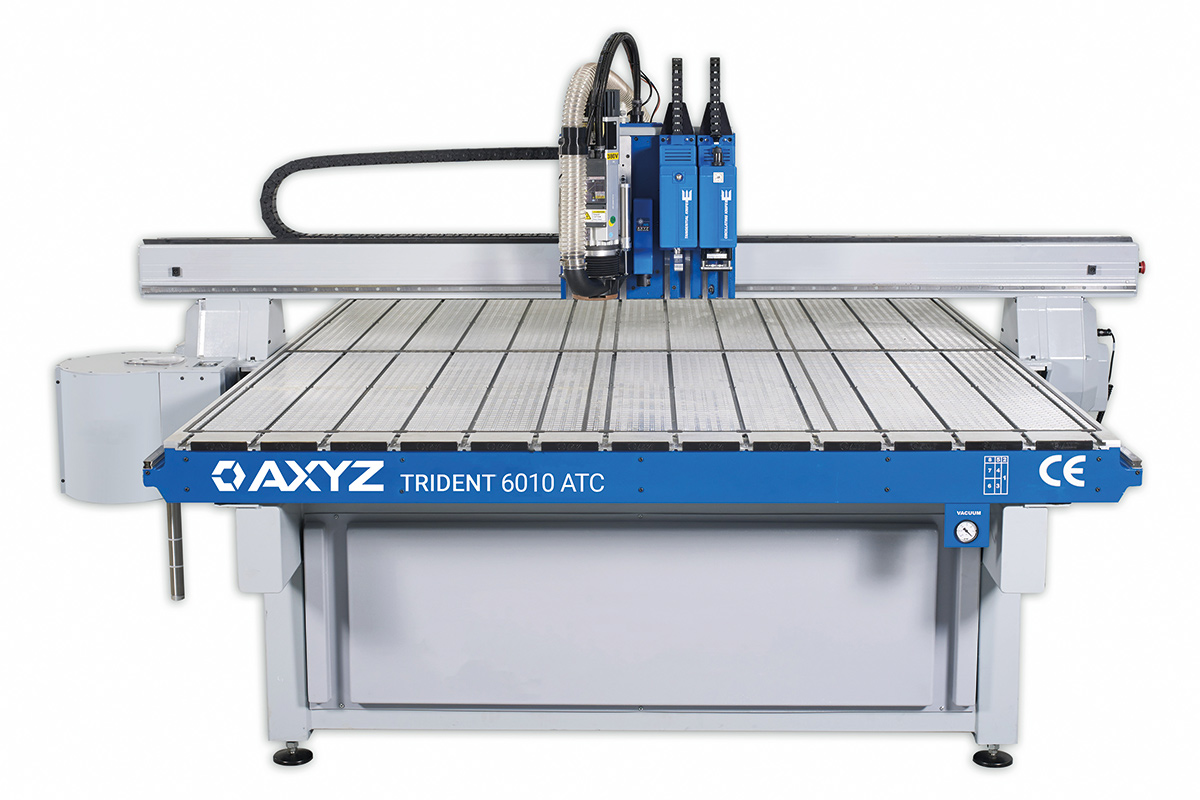 An important addition to the AXYZ portfolio has been the hybrid Trident print finishing system, recently redesigned to include new routing/cutting heads that are much easier to operate and service, a narrower carriage construction contributing to a 12% smaller footprint and improvements to the knife-cutting units to allow a wider range of materials to be processed. Furthermore, knife blade attachments can now be as long as 120mm to better accommodate the processing of harder, thicker and heavier materials.